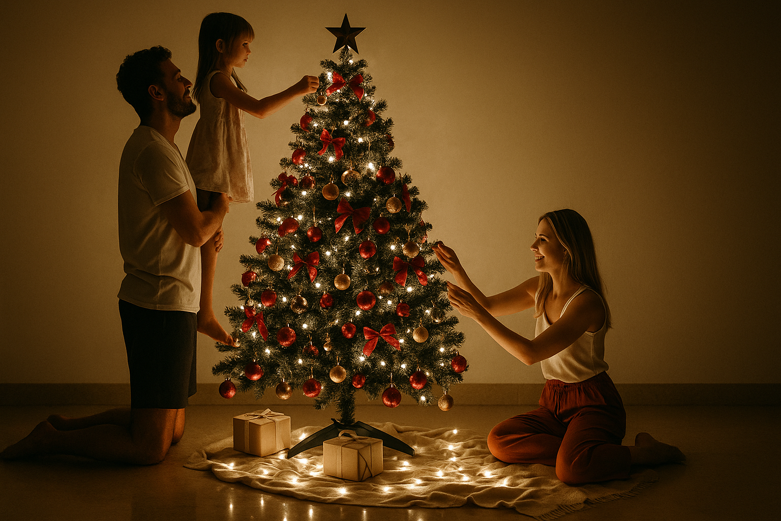 Для контрасту — трохи теплого золота або бежу внизу ялинки.